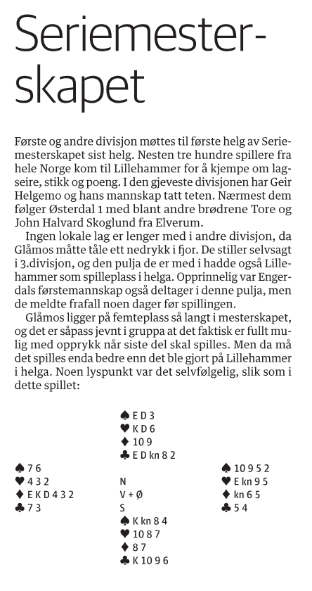 I sin bridgespalte 30. oktober rapporterte Åsmund Sandkjernan inn disse spillene fra spillinga på Lillehammer.