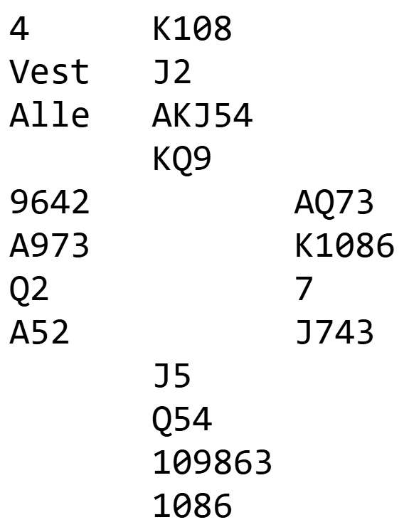 Frank åpnet med 4 hj, fikk 4 NT fra makker, og etter å ha bekreftet ett ess, ble kontrakten 6 hj. Med ruter K i kapp etter kløver Ess i utspill var det 12 stikk, og slemmen ble bare meldt ved ett av de andre bordene.