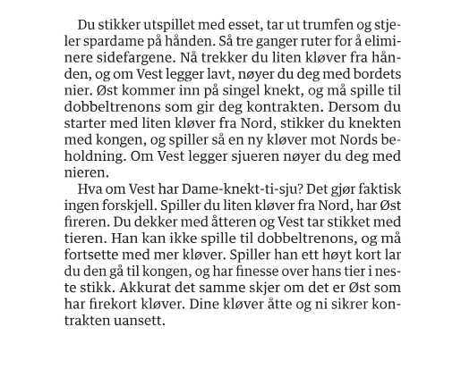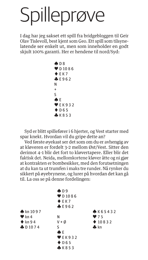 Vi har ikke noe spill fra årets 4. divisjon, men stjeler igjen fra Åsmund Sandkjernans gode bridgespalte i Arbeidets Rett. Denne spalten sto på trykk i Retten 15. mai i vår.