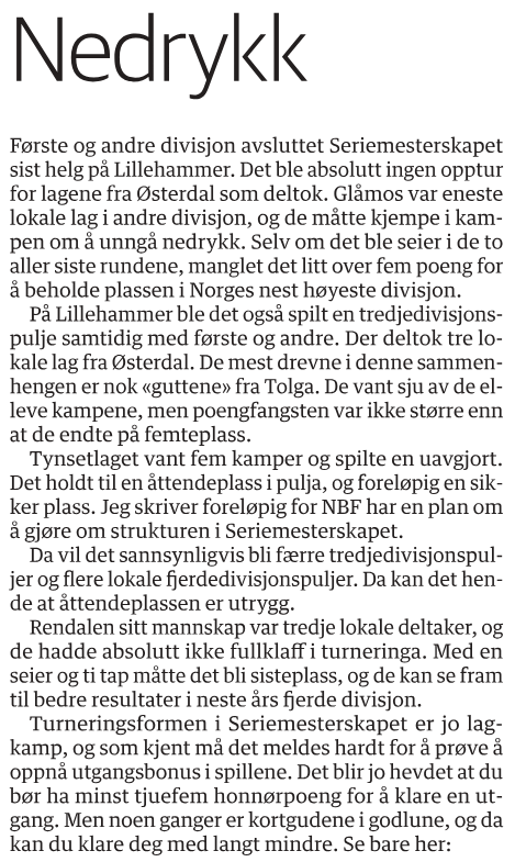 Vi fortsetter med å sakse innhold fra Åsmund Sandkjernan sin spalte i Arbeidets Rett. Dette innlegget sto på trykk 6. februar 2025, og kommer fra forrige sesongs seriemesterskap.