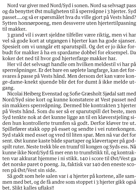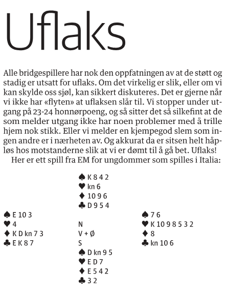 Uflaks er noe som rammer oss bridgespillere mer frekvent enn resten av landets befolkning, og akkurat det var inngangen til Åsmund Sandkjernans bridgespalte i Arbeidets Rett 24. juli i fjor.