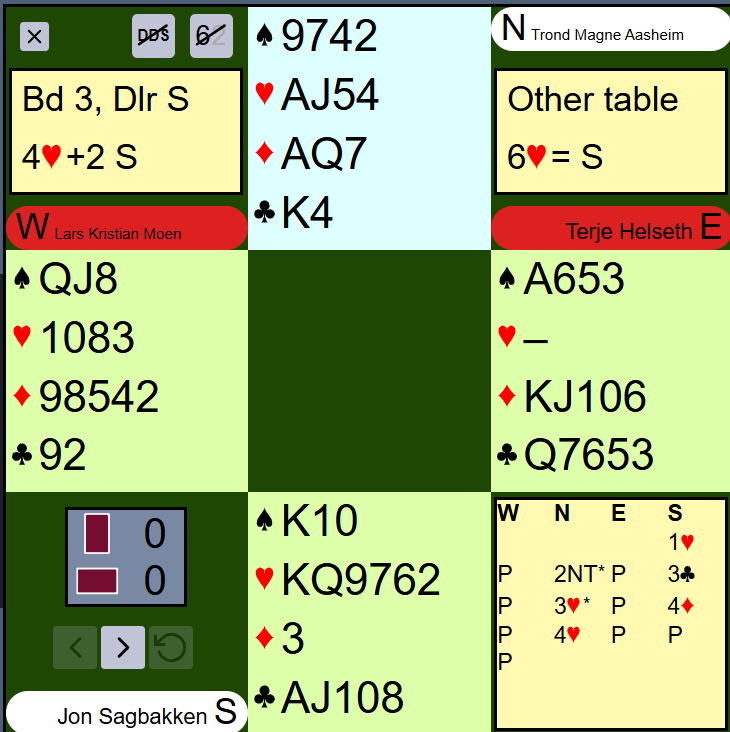 Meldingsforløpet sees på bildet under. 2NT er invitt-Stenberg, 3 kløver viser tillegg, mens 3 hjerter ber om singleton. Når Sagbakken viste singel ruter følte Aasheim at hans seks poeng i ruter ikke var av stor verdi. Slemmen står på å stjele to kløver i bordet, samt at spar ess må sitte foran kongen. Denne gangen var kortgudene på Jessheim sin side, og dermed ble det tap for våre gutter.